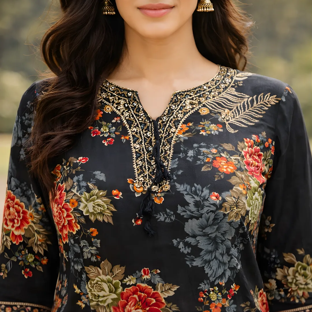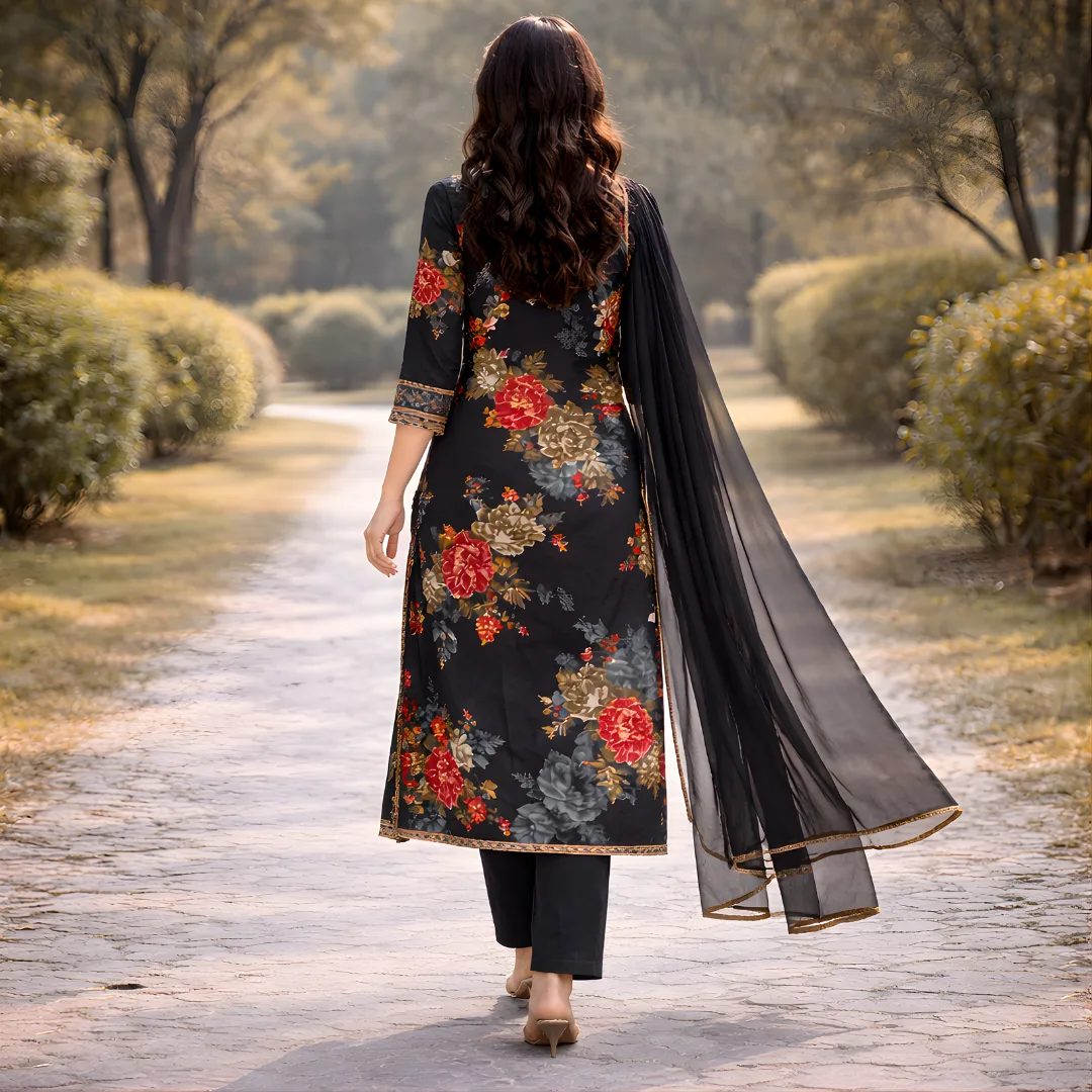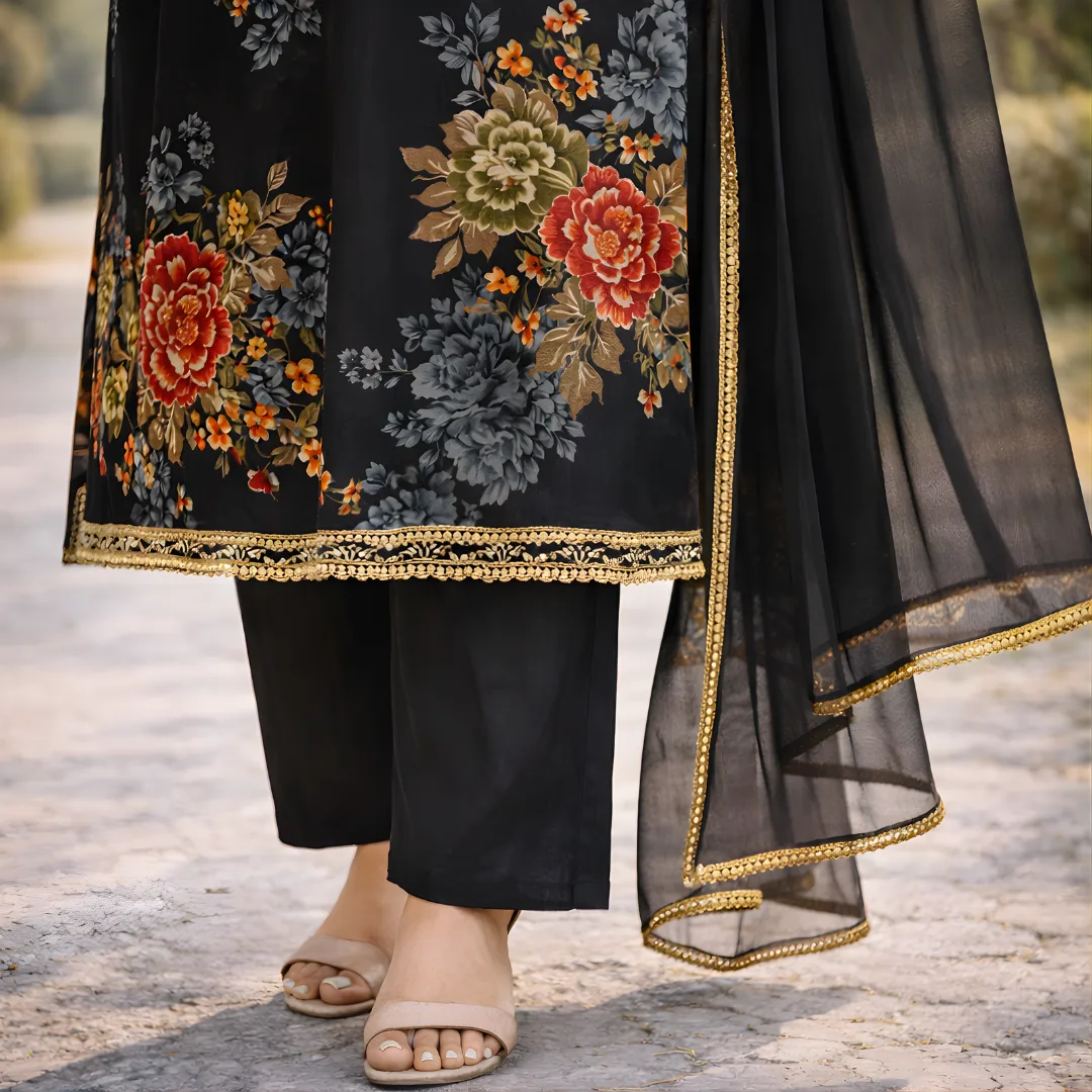 Add timeless elegance to your ethnic collection with this Black Floral Printed Salwar Suit Set. Designed with vibrant floral prints, the kurta features delicate embroidery on the neckline and sleeves, paired with comfortable straight pants and a lightweight sheer dupatta with gold border detailing. Perfect for festive occasions, casual gatherings, and evening wear.