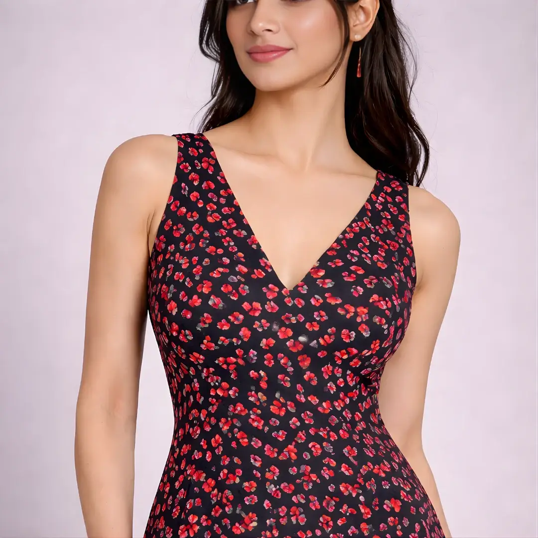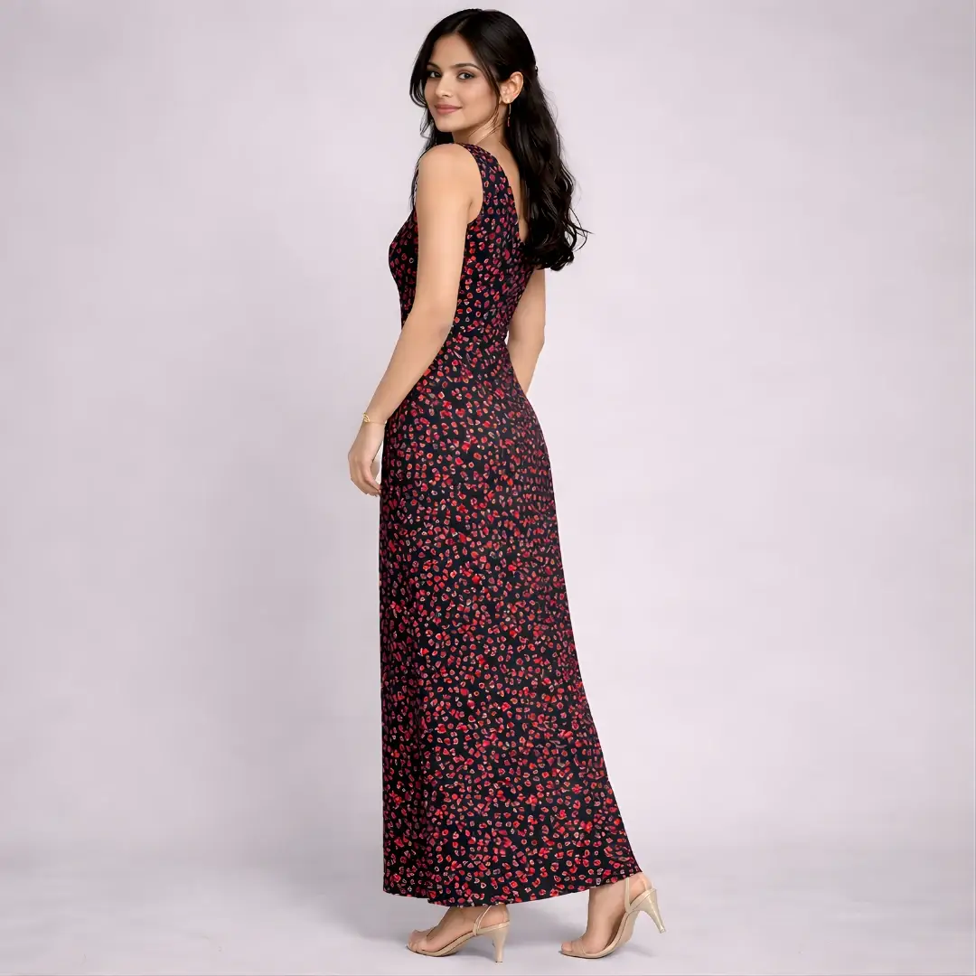 Make a bold style statement with this Black & Red Floral Print One Piece Maxi Dress. Designed with a flattering V-neckline and sleeveless silhouette, this dress beautifully combines elegance and comfort. The vibrant red floral print on a black base adds a timeless charm, making it perfect for casual outings, evening gatherings, and special occasions.