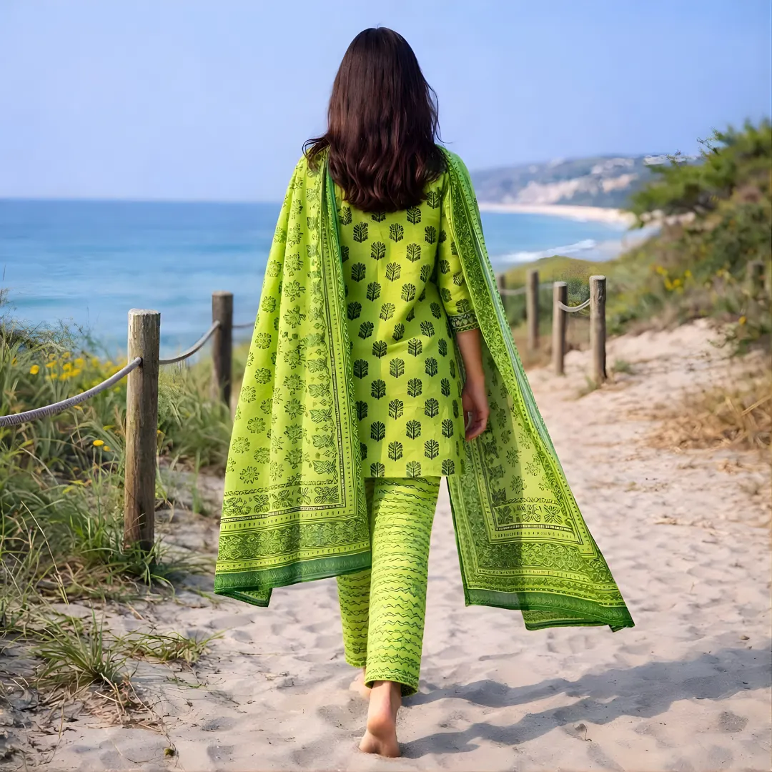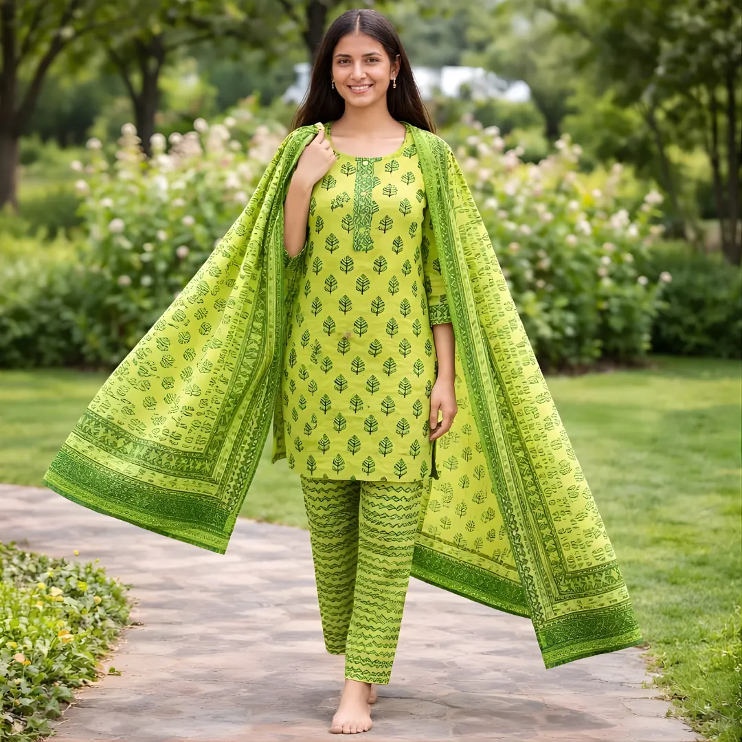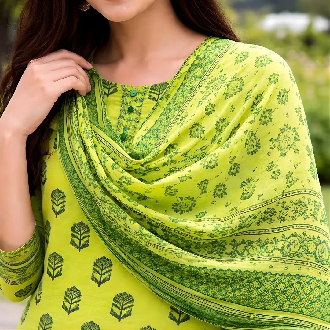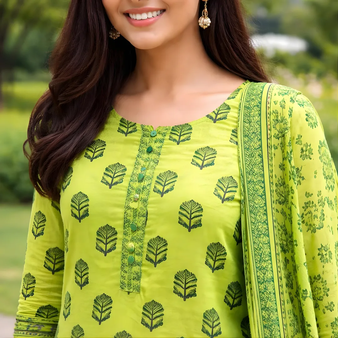 Add a fresh pop of colour to your ethnic wardrobe with this Lime Green Printed Salwar Suit for women. Designed in a soothing yet vibrant lime green shade, this suit features an elegant leafy block print that feels modern, minimal, and effortlessly stylish.