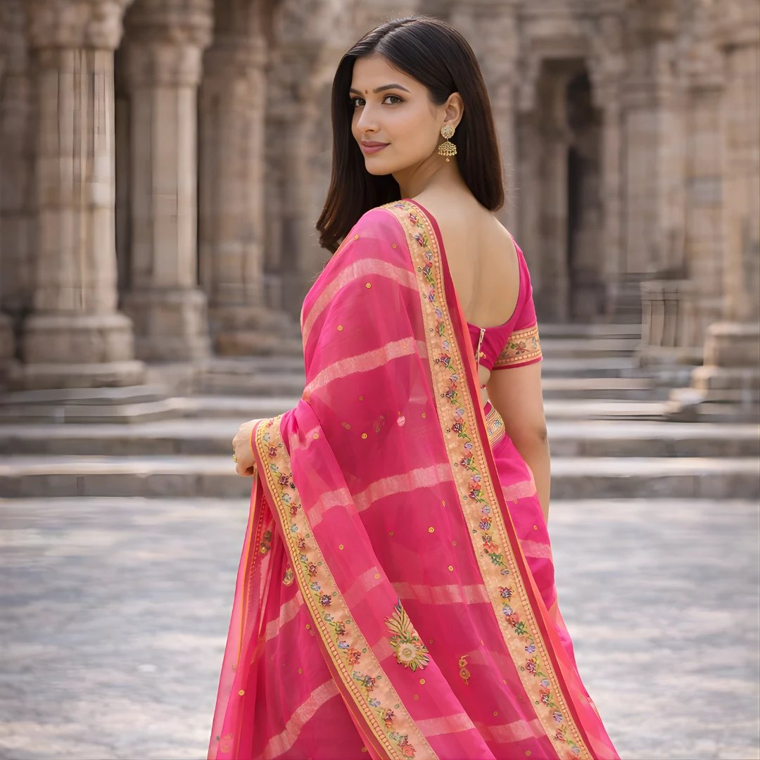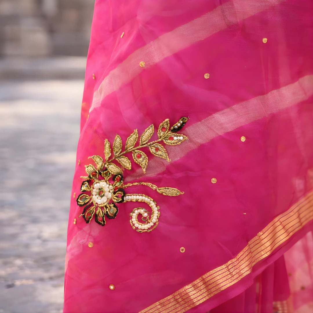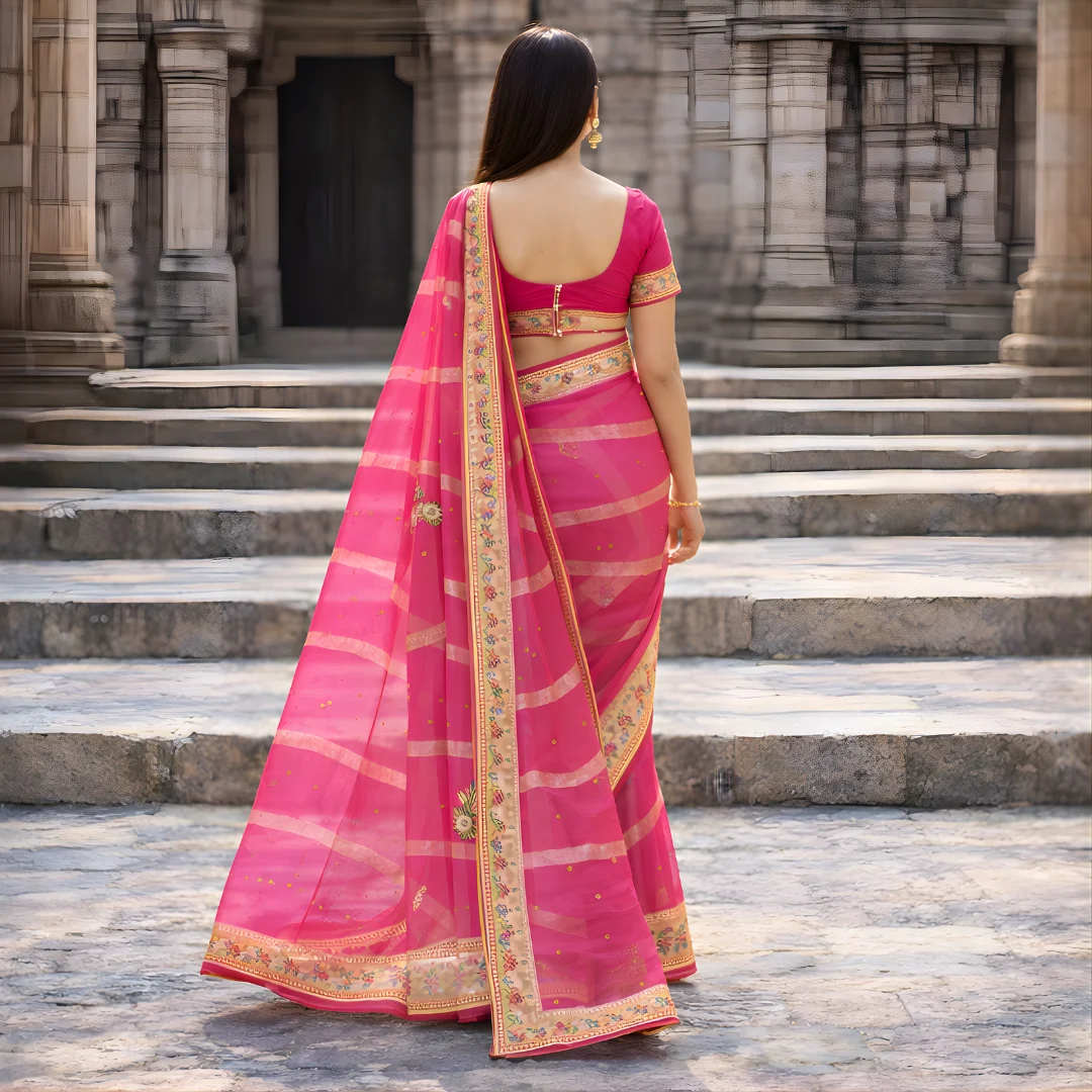 Bring vibrant elegance to your ethnic wardrobe with this gorgeous rani pink saree designed for festive glamour. The saree features a rich hot pink tone enhanced with soft golden stripe detailing, giving it a premium traditional look. The highlight is the beautifully crafted floral embroidered border that adds a designer finish, while small butti motifs across the saree give it a balanced, classy appeal.