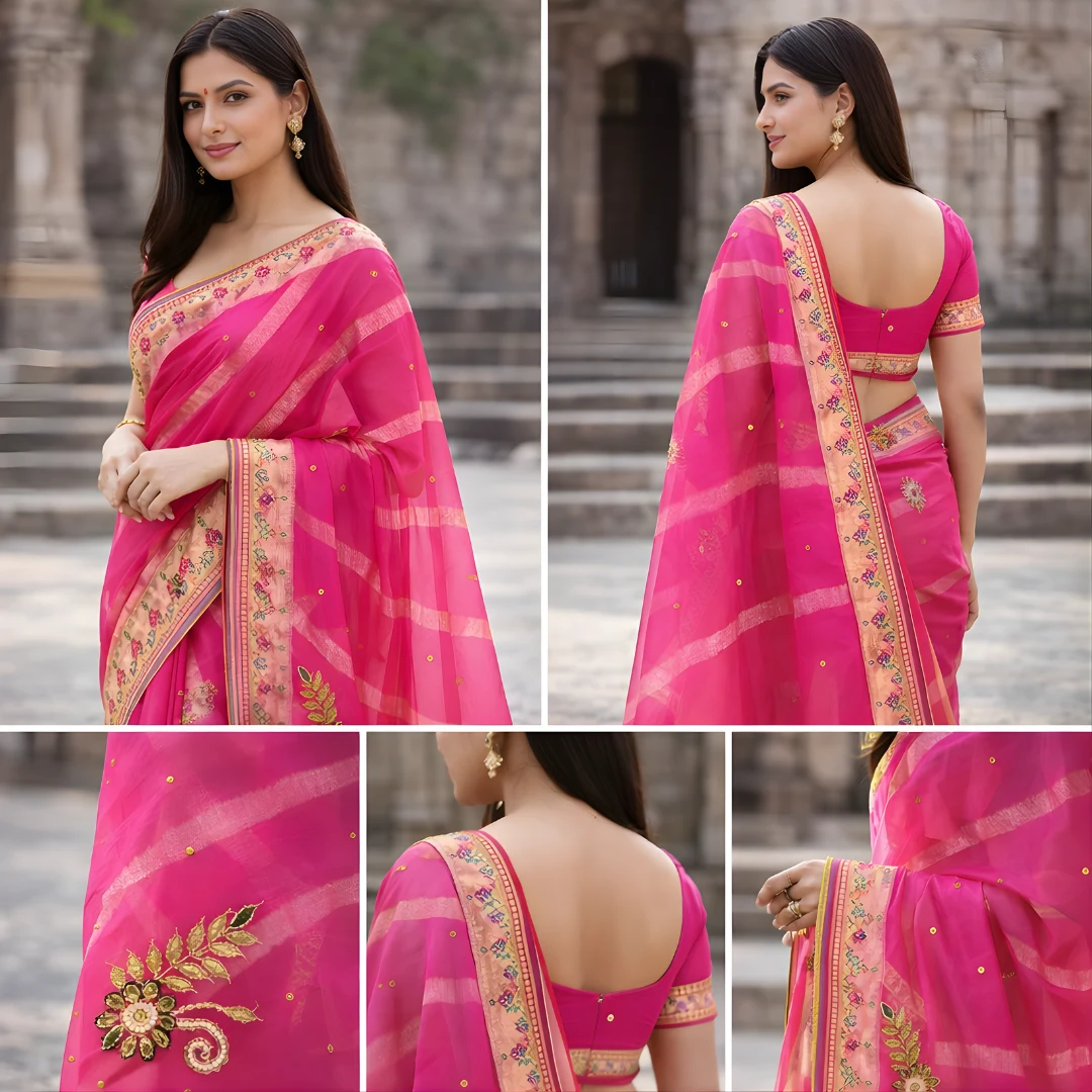 Paired with a matching blouse, this saree is a perfect choice for weddings, festive celebrations, family functions, parties and traditional events. Its graceful drape and lightweight feel make it comfortable for long wear while still looking rich and stylish.