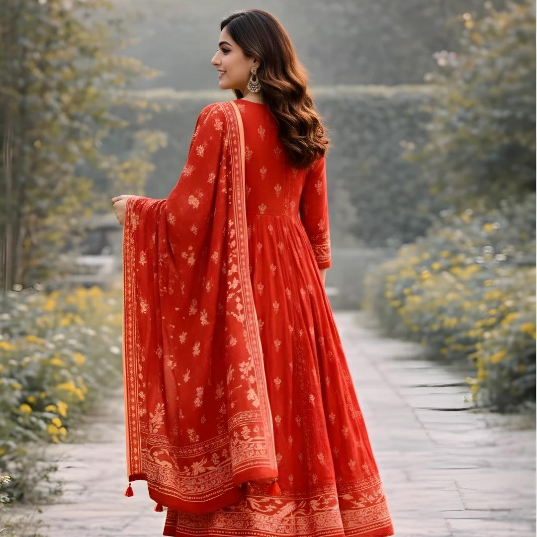 Add timeless charm to your ethnic collection with this Red Frock Pattern Cotton Salwar Suit. Made from breathable cotton fabric, the frock-style kurta features elegant floral prints, a beautifully detailed neckline, and a graceful flared silhouette. The matching cotton pants ensure everyday comfort, while the printed dupatta with decorative borders completes the look. Perfect for daily wear, festive mornings, casual outings, and office wear.