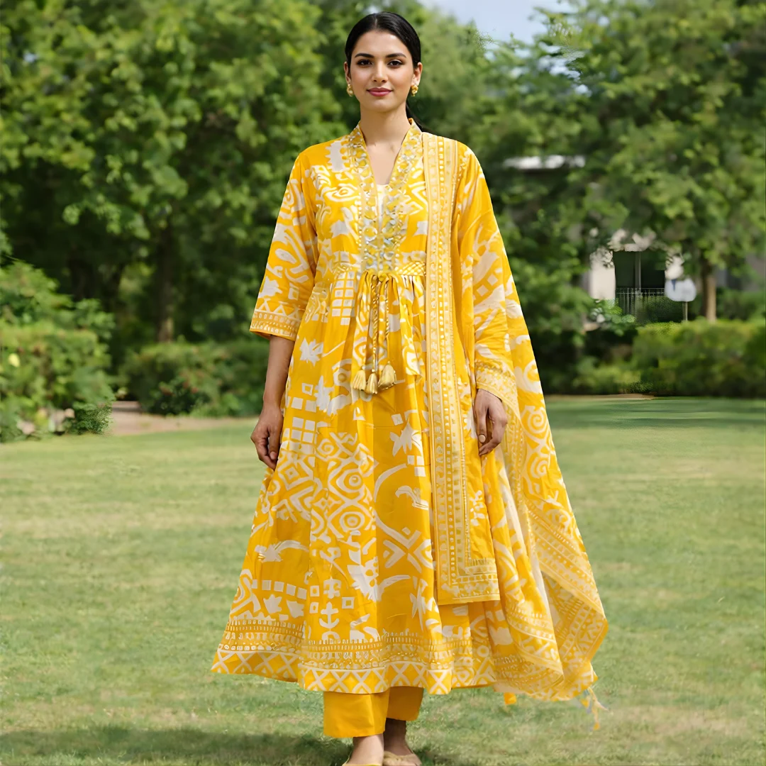 Add a splash of sunshine to your ethnic wardrobe with this Yellow Floral Printed Anarkali Salwar Suit. Featuring a beautifully flared silhouette, intricate floral embroidery on the neckline, and playful tassel detailing, this suit blends comfort with festive elegance. Paired with matching pants and a soft dupatta, it is perfect for daytime festivities, celebrations, and casual ethnic outings.